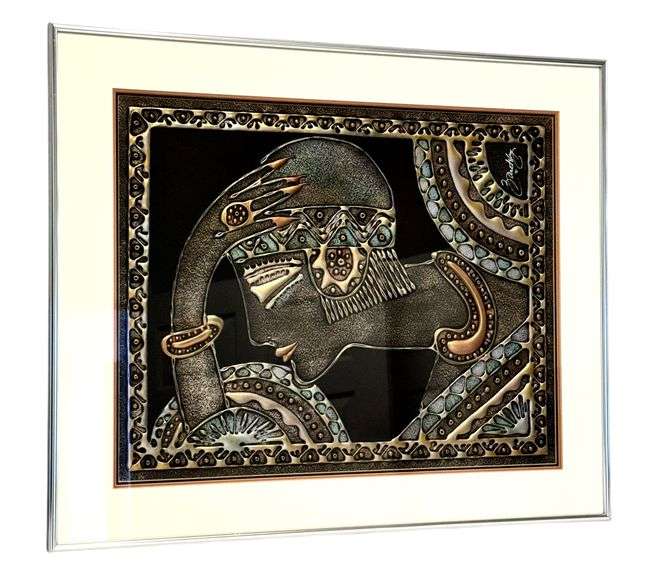 A dynamic mixed-media metallic artwork by New York artist Joel Zaretsky. Signed bottom right. Circa 1980s. A unique painting which depicts an abstracted figure. Zaretsky (1938-2022) used vinyl copolymer and metal pigmented paint to arrive at renderings that look like metal. The artist often used the tagline "It's Not Metal" which captivated the collectors of his art. Zaretsky was a self-employed life long creative craftsman and visionary artist. From a private collection.
